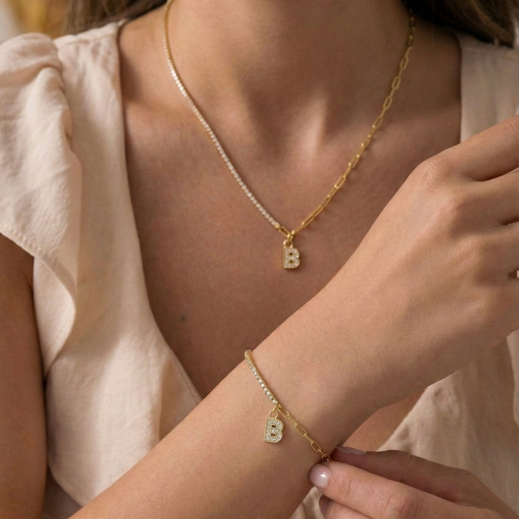 Letter Kolye & Bileklik Seti: Bir tarafı kristal taşlı su yolu, diğer tarafı ise modern paperclip zincirden oluşan dualistik tasarımıyla bu set; merkezinde sallanan kişiye özel harf ucu sayesinde hem boynunuzda hem de bileğinizde kusursuz bir uyum ve ışıltılı bir bütünlük sergiler.