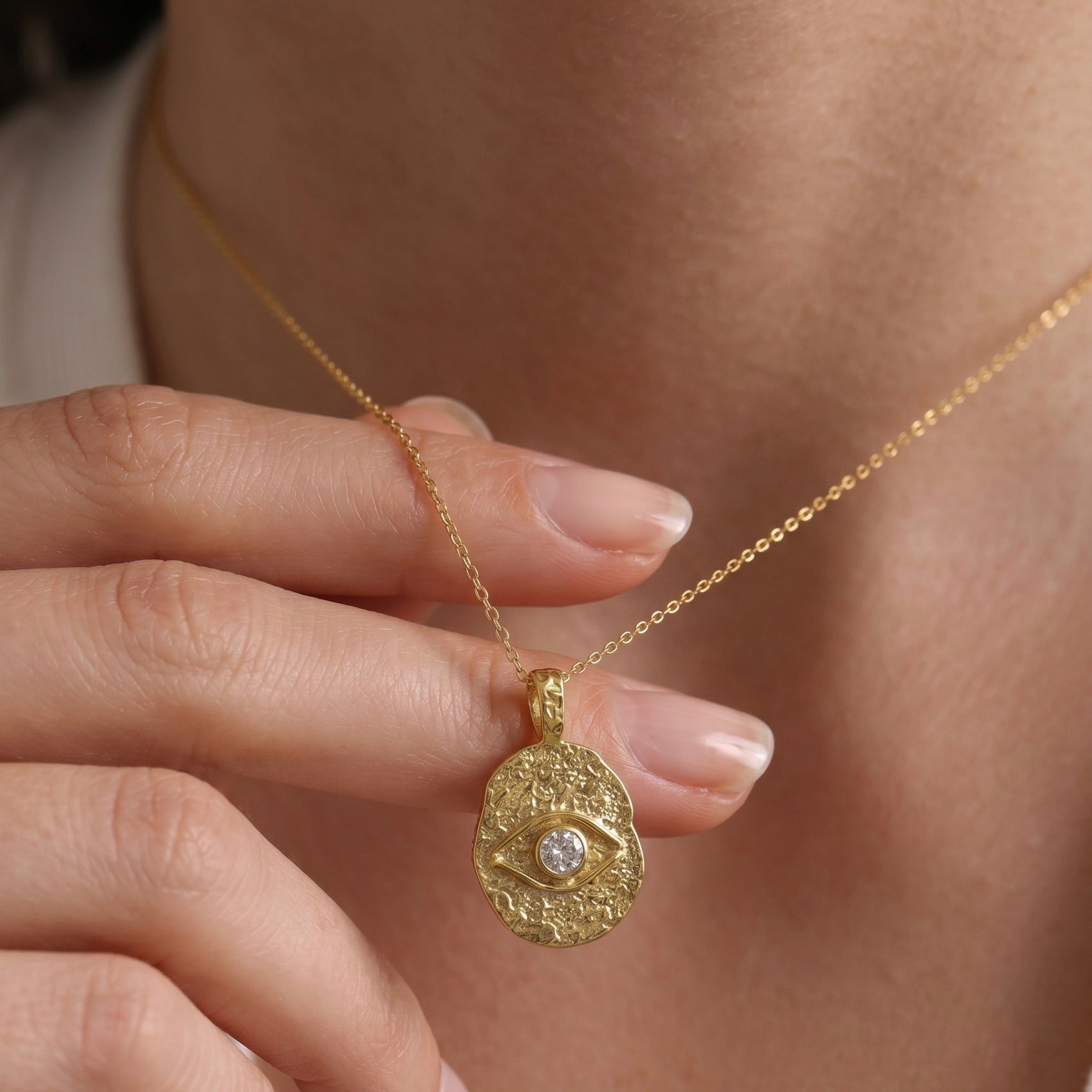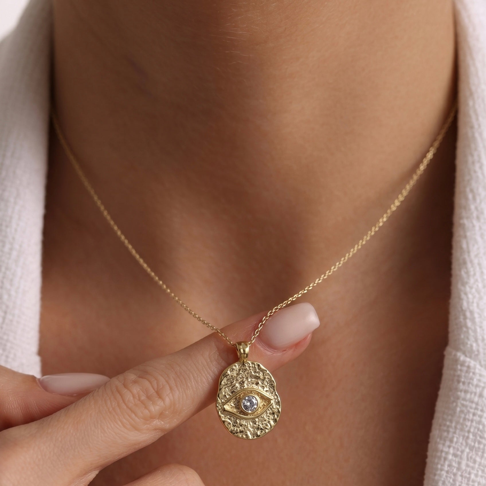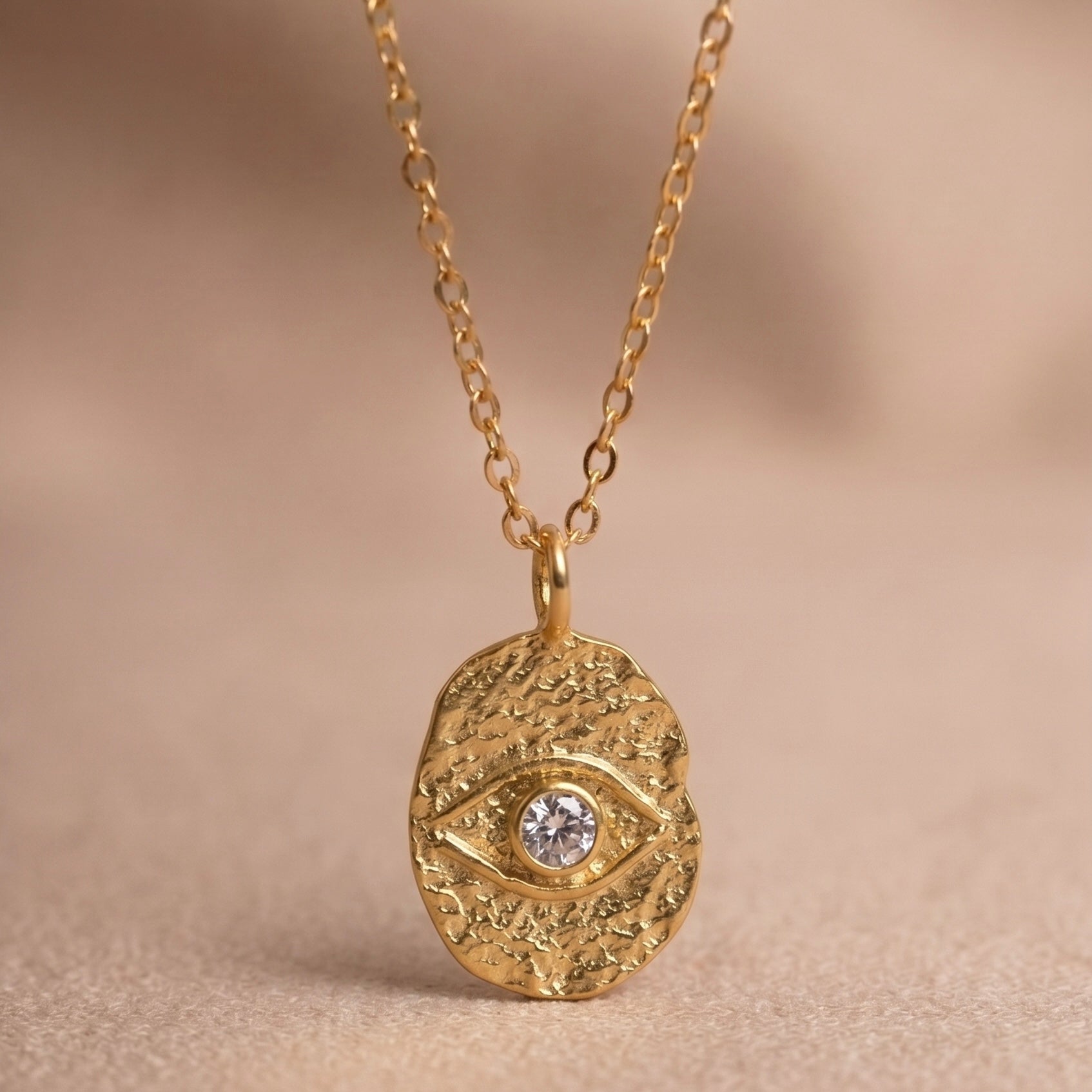 Kadim bir koruma sembolünü organik el işçiliği dokusuyla birleştiren Medallion Eye, mistik enerjiyi modern ve zarif bir tılsım olarak boynunuza taşır.