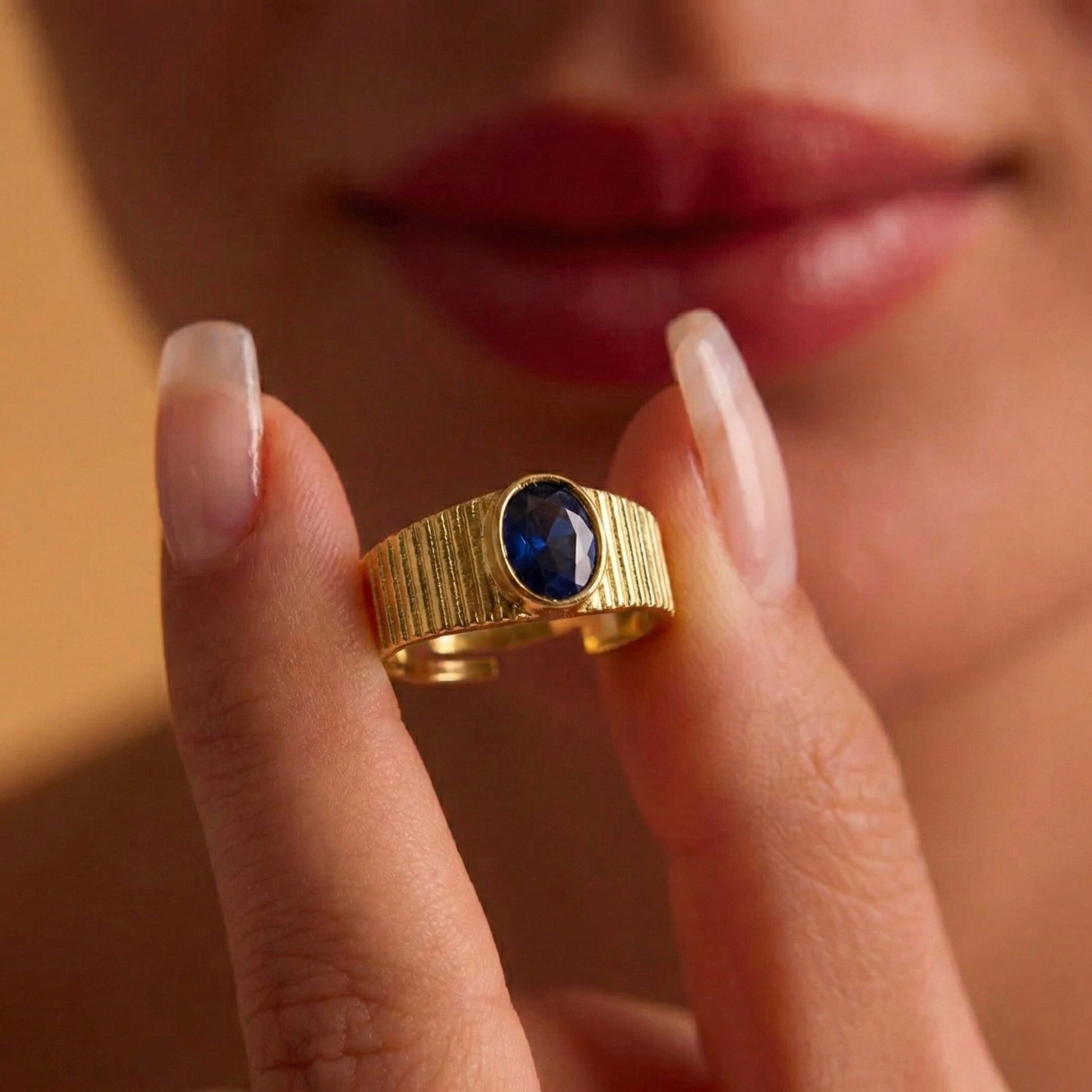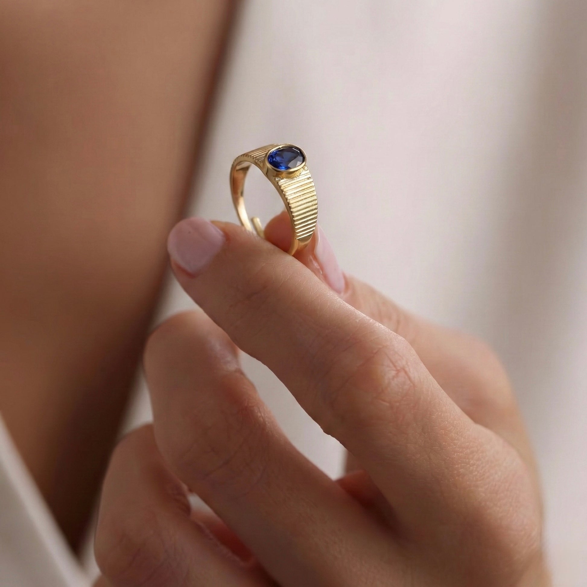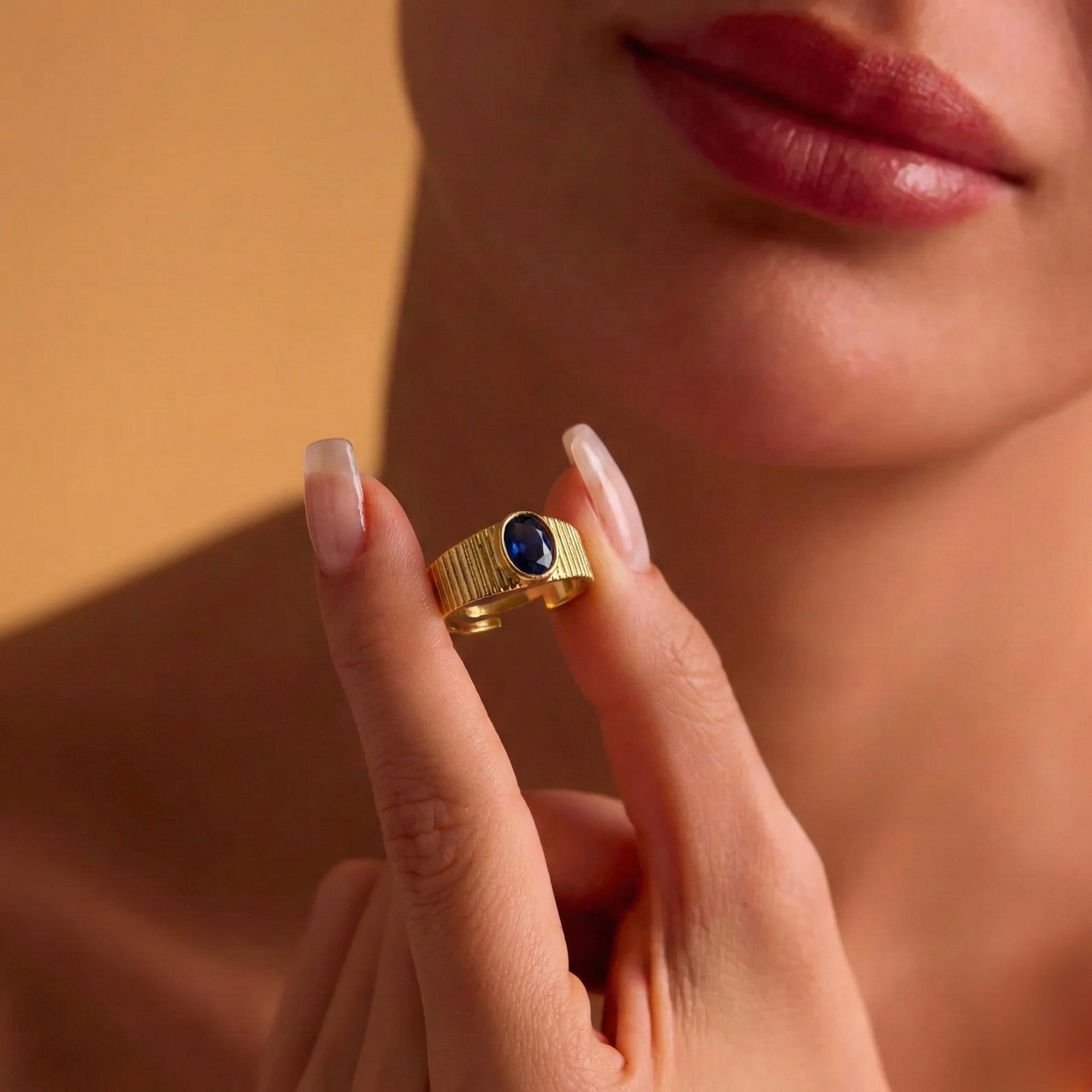 Klasik mühür yüzüğü tasarımına modern bir soluk getiren bu parça, dikey çizgili (ribbed) dokusuyla stilinize karakter katar. Merkezinde yer alan oval kesim derin mavi kristal taş, metalin ışıltısıyla kusursuz bir kontrast oluşturarak sofistike bir odak noktası yaratır. Her bir Minon parçası usta zanaatkarların elinde şekillenir; bu nedenle el işçiliğinden kaynaklanan minik detay farklılıkları her tasarımı size özel kılar.