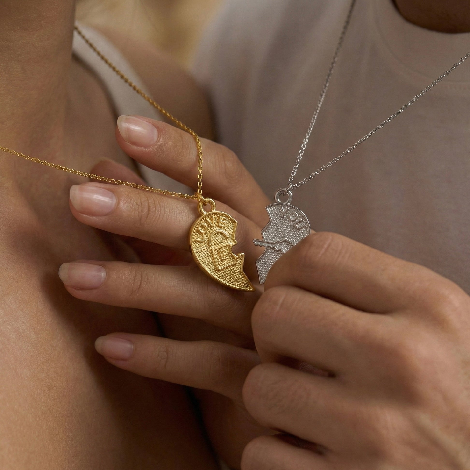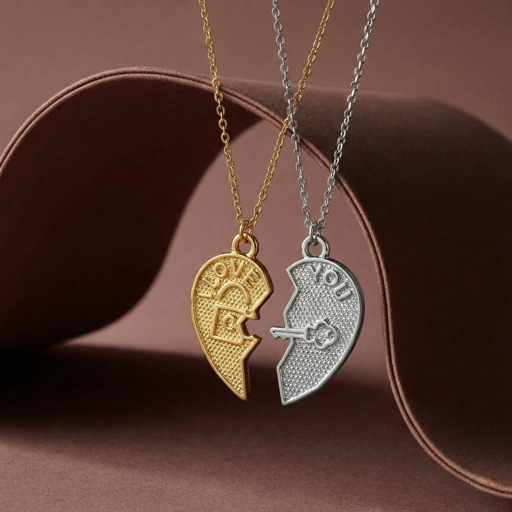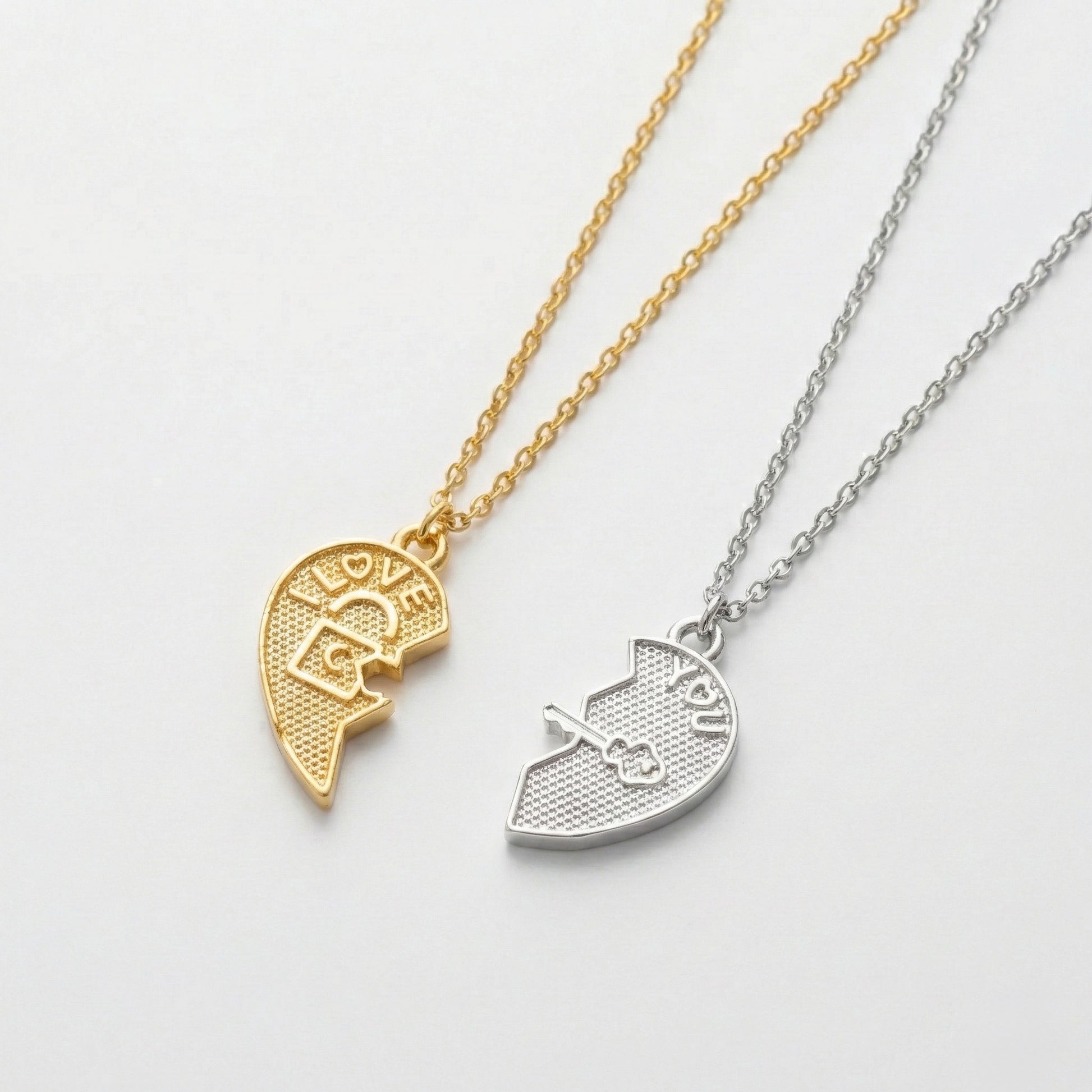 Birbirini tamamlayan iki ruhun hikayesini boynunuzda taşıyın. "Love" ve "You" yazılı iki yarım kalpten oluşan bu özel tasarım, iç içe geçen kilit ve anahtar mekanizmasıyla aşkın kusursuz uyumunu simgeler. Set içeriğinde kadın için zarafeti temsil eden Gold (Altın Kaplama) yarım kalp, erkek için ise modern ve maskülen bir duruş sergileyen Silver (Gümüş Kaplama) yarım kalp bir arada sunulur. Her bir Minon parçası usta zanaatkarların elinde şekillenir; bu nedenle el işçiliğinden kaynaklanan minik detay farklılıkları her seti size özel ve eşsiz kılar.