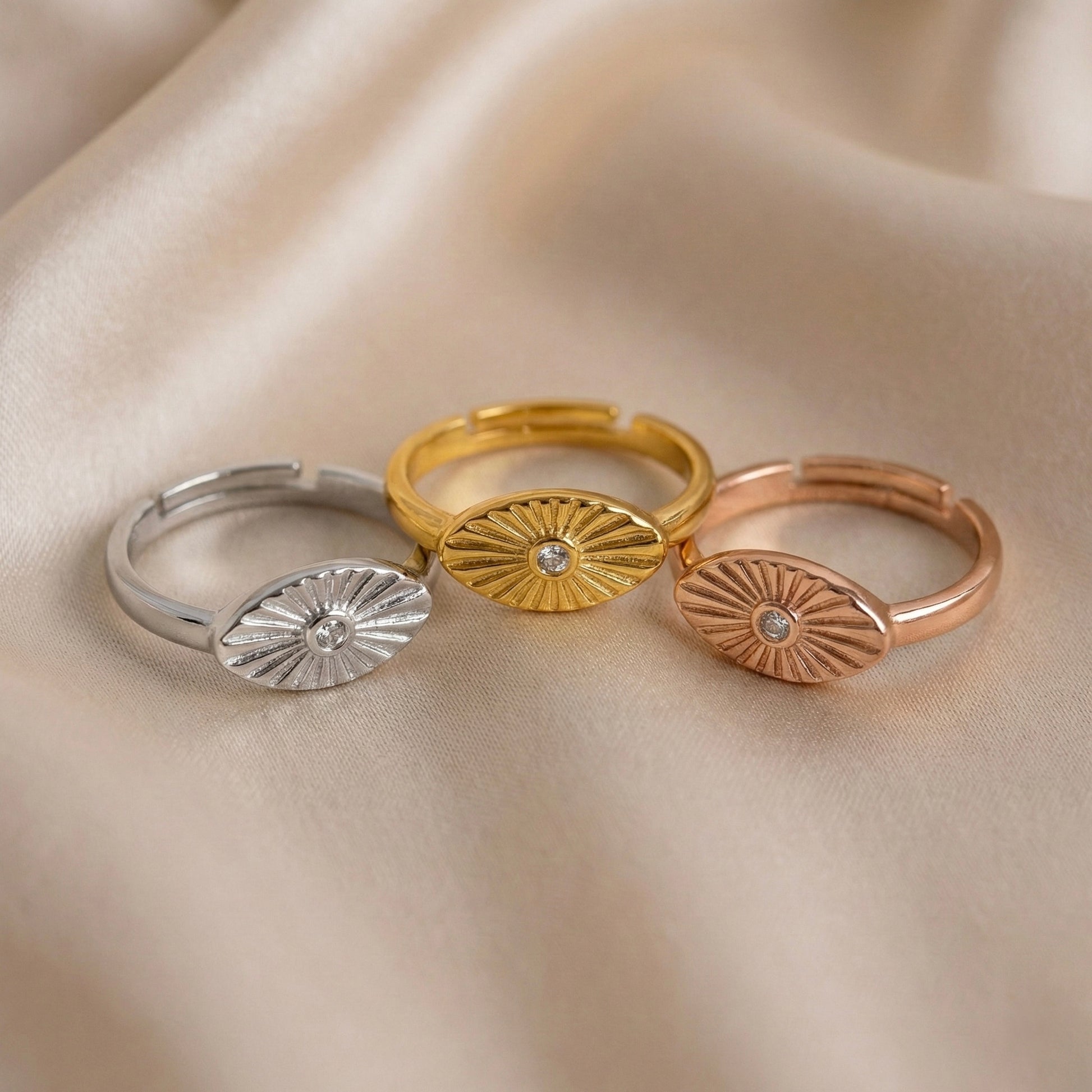 Şafağın ilk ışıklarından ve her şeyi aydınlatan bir parıltıdan ilham alan bu tasarım, markiz (badem) formu üzerindeki ışınsal detaylarla stilinize mistik bir derinlik katar. Merkezindeki ışıltılı taş, tasarıma "Sessiz Lüks" anlayışına uygun rafine bir parıltı kazandırırken, vintage dokusuyla zamansız bir imza niteliği taşır. Her bir Minon parçası usta zanaatkarların elinde şekillenir; bu nedenle el işçiliğinin doğasından kaynaklanan minik detay farklılıkları her tasarımı eşsiz ve size özel kılar.