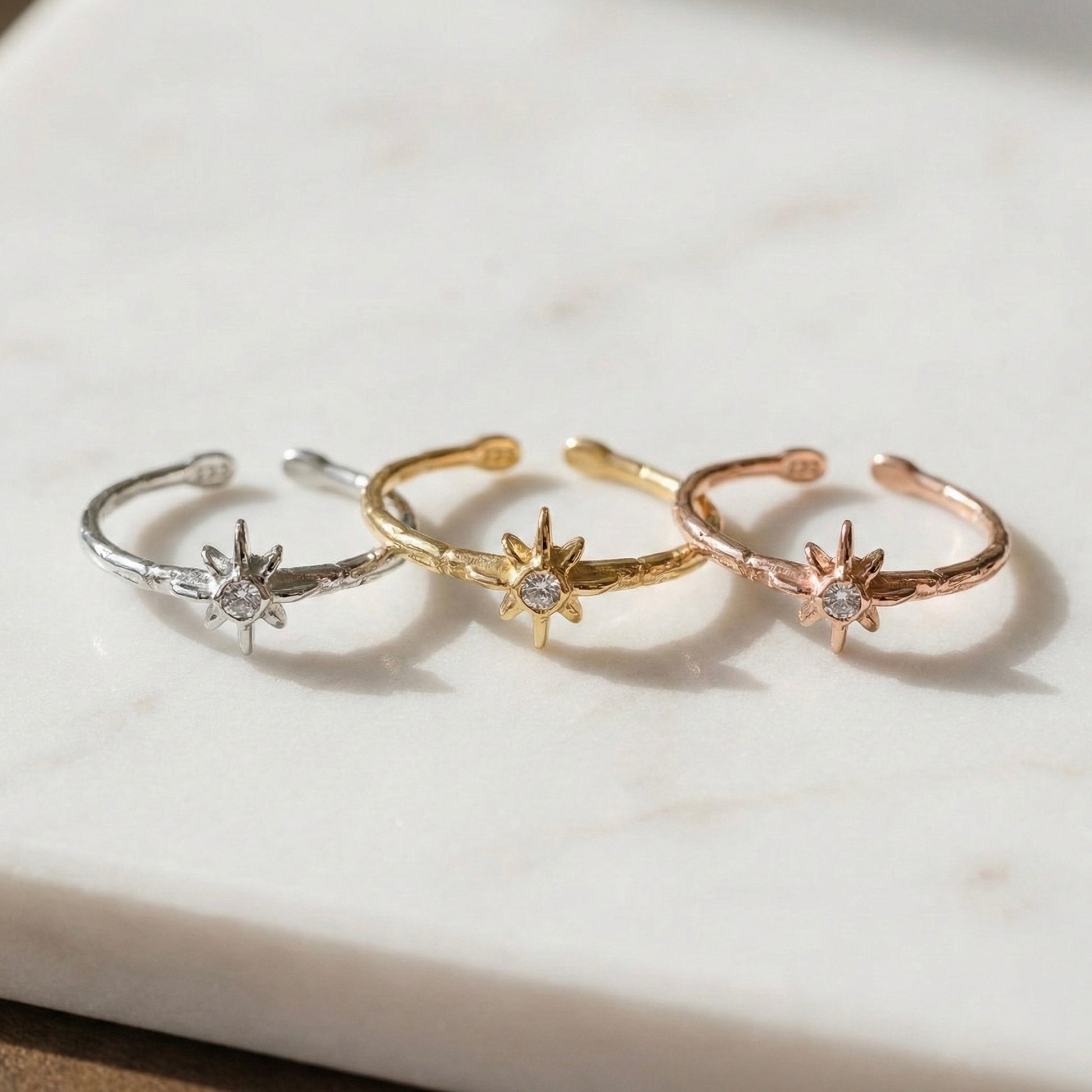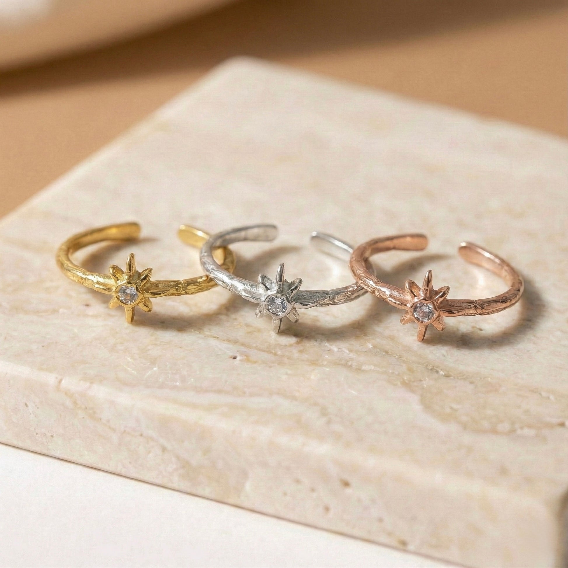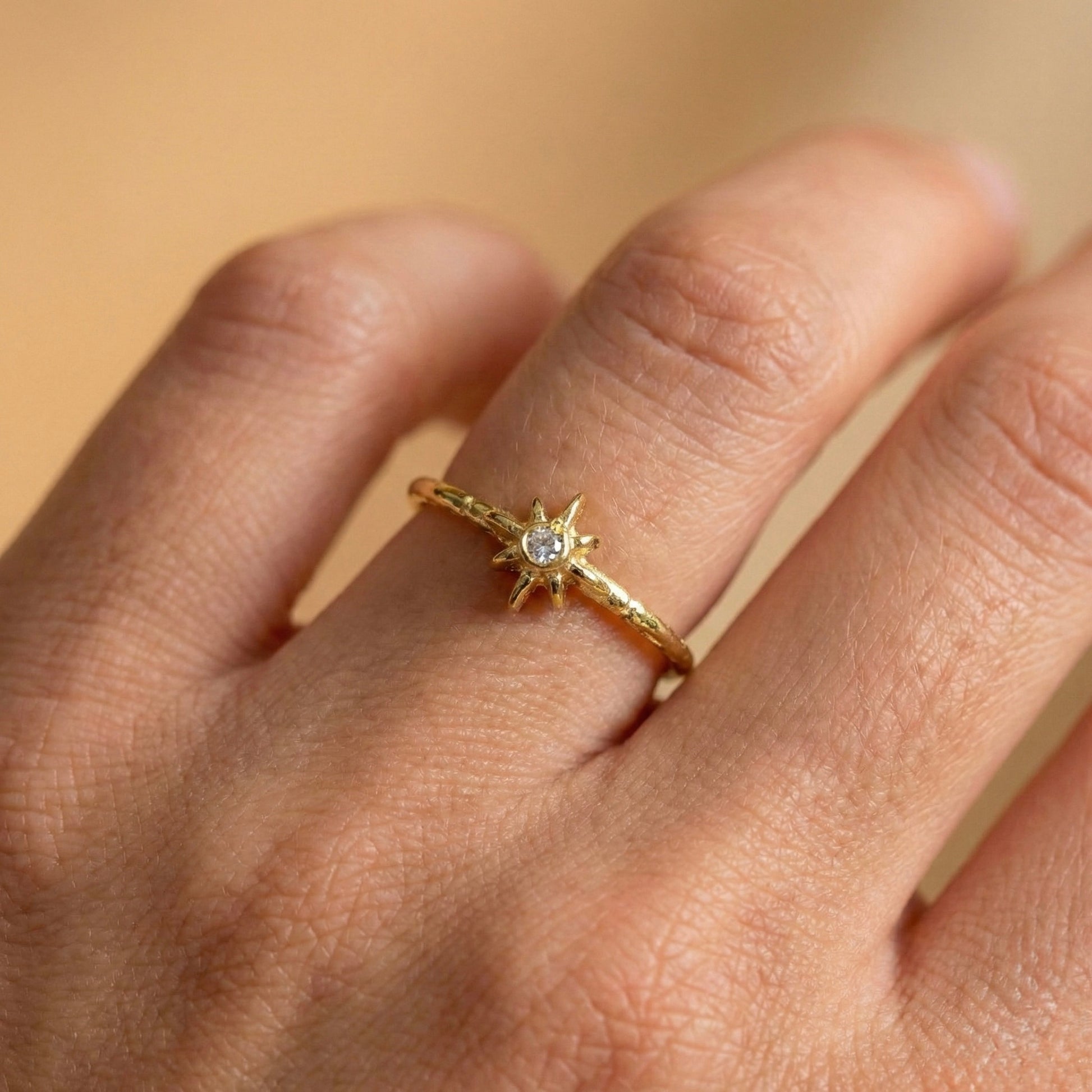 Karanlığı aydınlatan en parlak yıldızdan ilham alan bu tasarım, stilinize zarif bir ışık ve rehberlik katar. Merkezindeki parıltılı taş, el işçiliğiyle dokulandırılmış bant yapısıyla birleşerek "Sessiz Lüks" estetiğini parmağınıza taşır. Hem tek başına asil bir duruş sergiler hem de diğer yüzüklerle kombinlemek için karakterli bir parça olarak öne çıkar. Her bir Minon parçası usta zanaatkarların elinde şekillenir; bu nedenle el işçiliğinin doğasından kaynaklanan minik detay farklılıkları her tasarımı eşsiz ve size özel kılar.