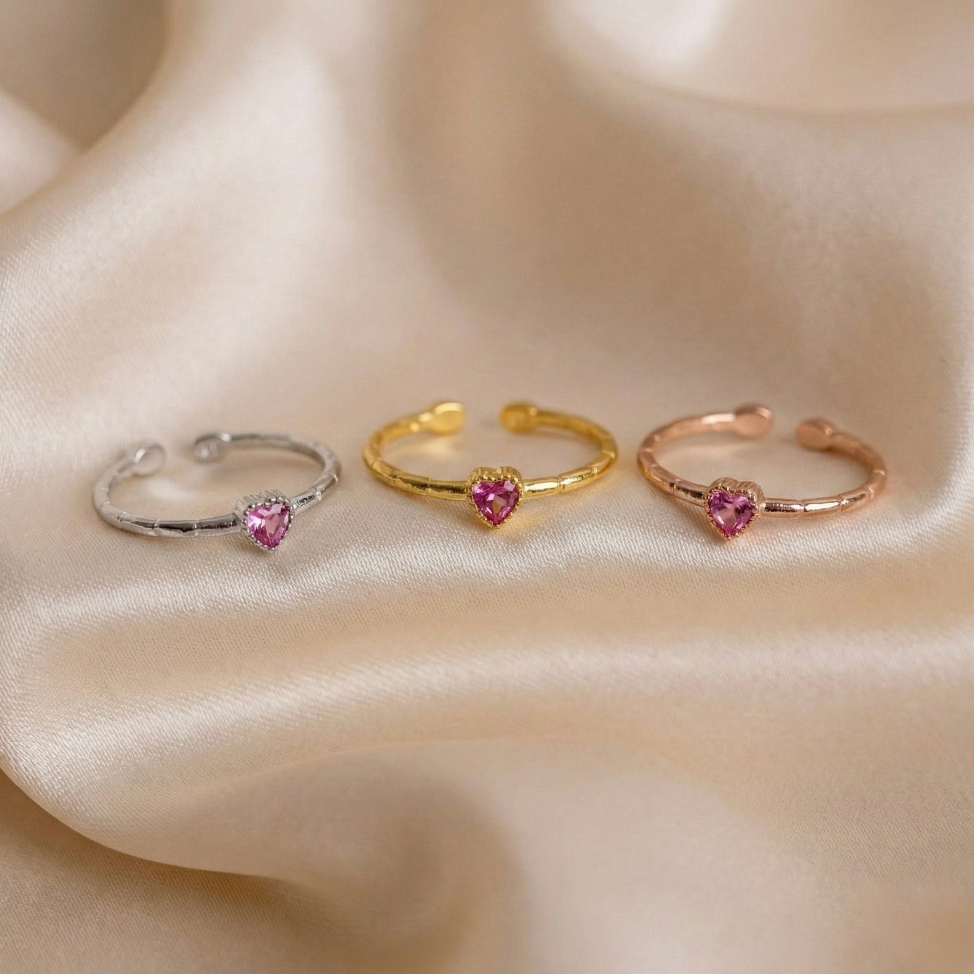 Küçük detayların büyük anlamlar taşıdığına inananlar için tasarlanan bu yüzük, sevginin en zarif sembolünü modern bir dokuyla buluşturuyor. Kalp kesim mikro kristal taşın ışıltısı, el işçiliğiyle kazandırılan organik bant dokusuyla birleşerek parmağınızda masum bir parıltı yaratır. Tek başına narin bir imza olarak kullanabilir veya diğer "Minon" yüzüklerinizle üst üste (stackable) kullanarak kendi stil hikayenizi yaratabilirsiniz.