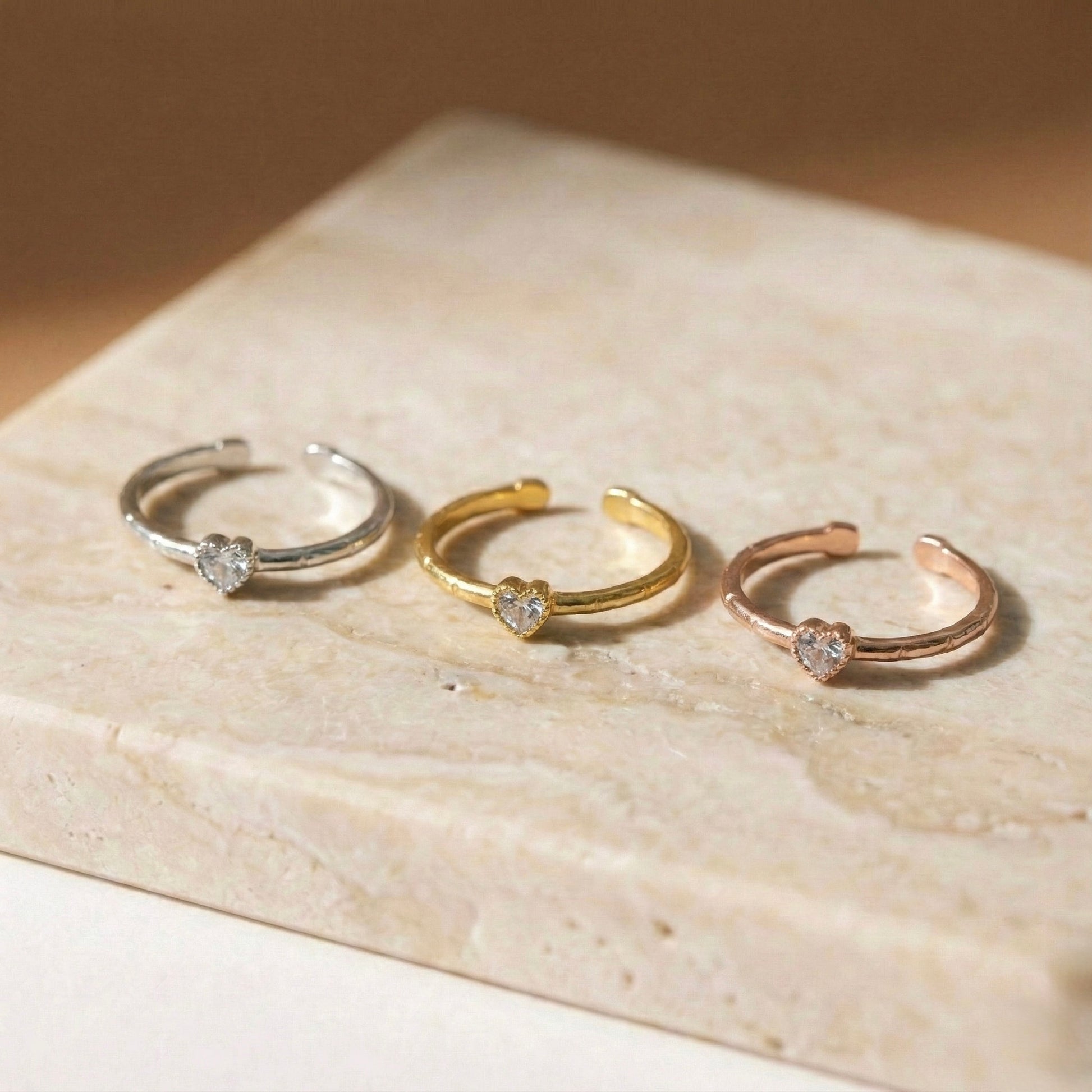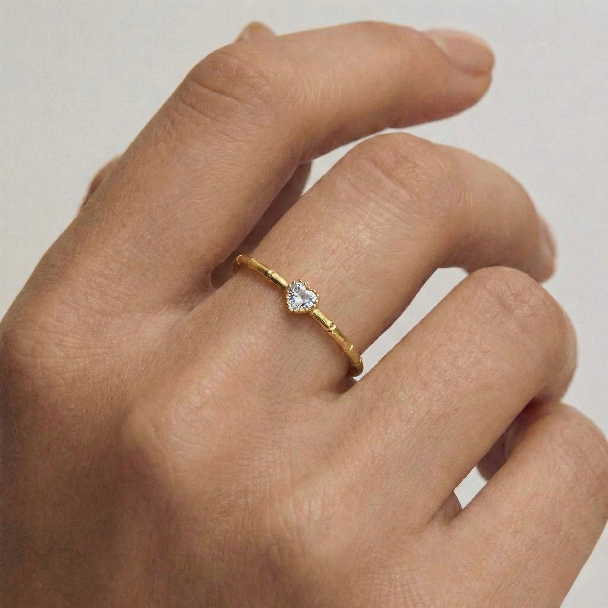 Küçük detayların büyük anlamlar taşıdığına inananlar için tasarlanan bu yüzük, sevginin en zarif sembolünü modern bir dokuyla buluşturuyor. Kalp kesim mikro kristal taşın ışıltısı, el işçiliğiyle kazandırılan organik bant dokusuyla birleşerek parmağınızda masum bir parıltı yaratır. Tek başına narin bir imza olarak kullanabilir veya diğer "Minon" yüzüklerinizle üst üste (stackable) kullanarak kendi stil hikayenizi yaratabilirsiniz.