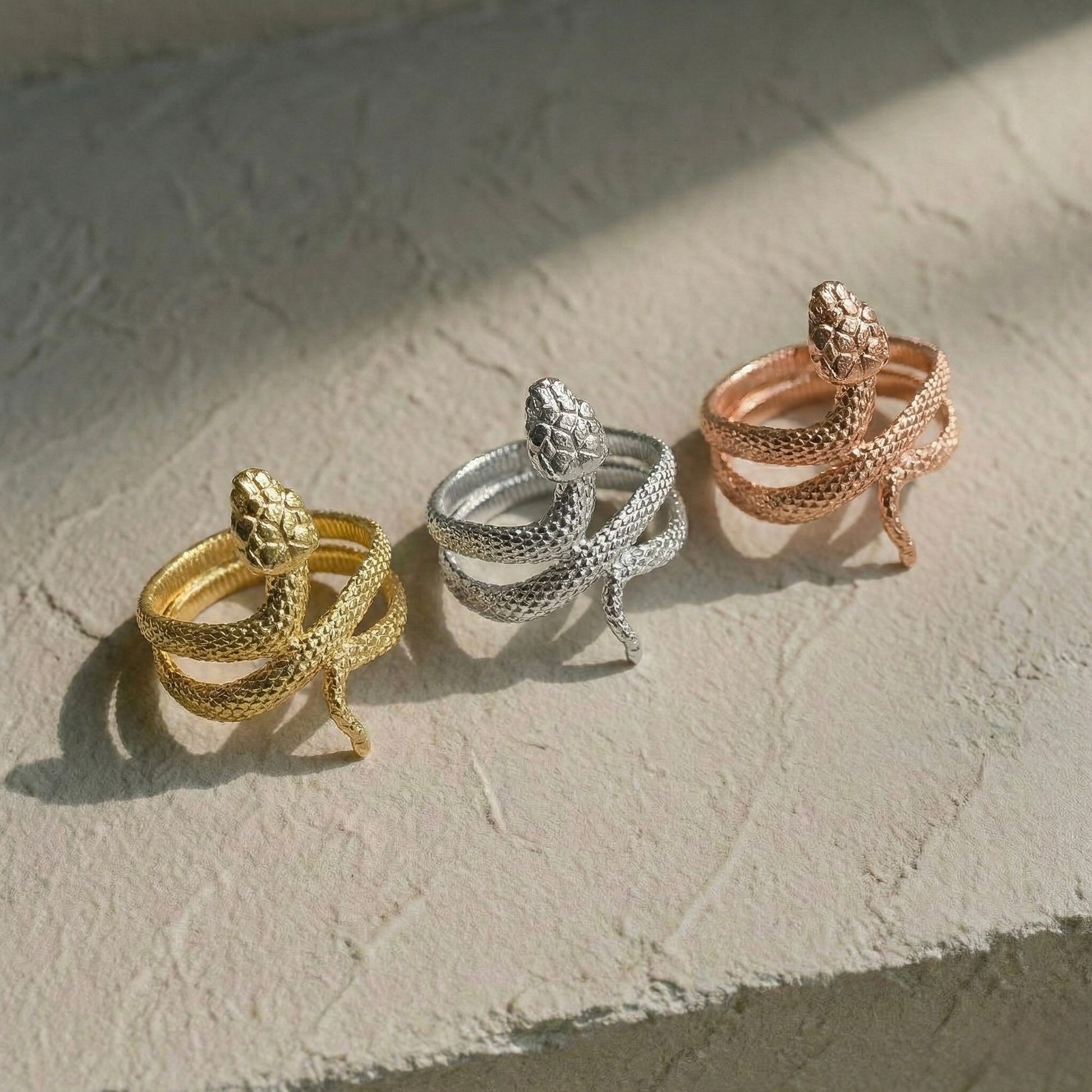 Gücün ve değişimin sembolü olan yılan formu, detaylı pul dokusuyla parmağınızı zarifçe sarar. Modern bir tılsım niteliğindeki bu tasarım, heykelsi yapısı ve organik formuyla rafine bir stilin en dikkat çekici tamamlayıcısıdır. Her bir Minon parçası usta zanaatkarların elinde şekillenir; bu nedenle el işçiliğinin doğasından kaynaklanan minik detay farklılıkları her tasarımı eşsiz ve size özel kılar.